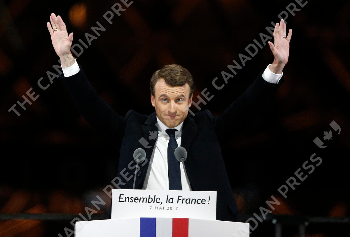 FILE - French President-elect Emmanuel Macron gestures during a victory celebration outside the Louvre museum in Paris, France, May 7, 2017. French President Emmanuel Macron hasn't officially declared that he's a candidate for April's presidential election yet. Critics say he's unfairly using his taxpayer-funded presidential pulpit to campaign for a second term while dragging out his widely expected announcement as long as possible. (AP Photo/Thibault Camus, File)