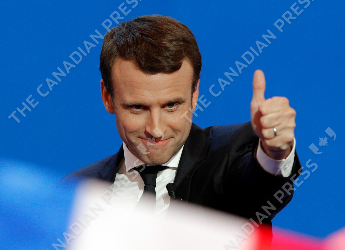 FILE - French centrist presidential candidate Emmanuel Macron thumbs up as he addresses his supporters at his election day headquarters in Paris, April 23, 2017. French President Emmanuel Macron hasn't officially declared that he's a candidate for April's presidential election yet. Critics say he's unfairly using his taxpayer-funded presidential pulpit to campaign for a second term while dragging out his widely expected announcement as long as possible. (AP Photo/Christophe Ena, File)
