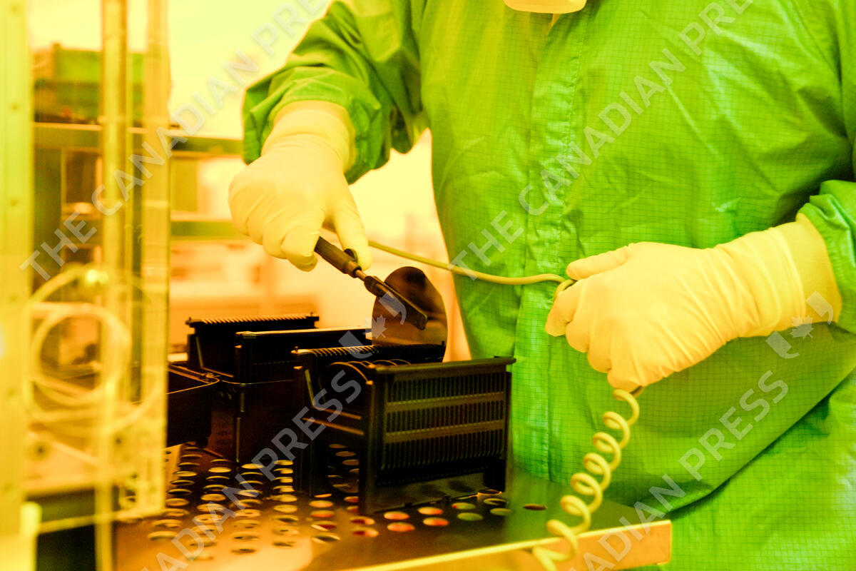 An operations team member inspects a four-inch indium phosphide wafer, prior to a formation of holographic gratings process in a clean room, during a demonstration at the National Research Council’s Canadian Photonics Fabrication Centre, in Ottawa, on Monday, Feb. 28, 2022. THE CANADIAN PRESS/Justin Tang