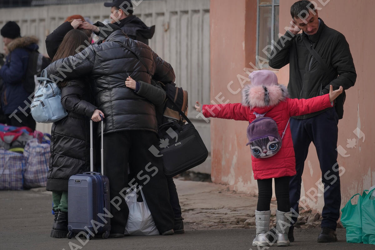 People hug while waiting for a Kiev bound train in Kostiantynivka, the Donetsk region, eastern Ukraine, Thursday, Feb. 24, 2022. (AP Photo/Vadim Ghirda)