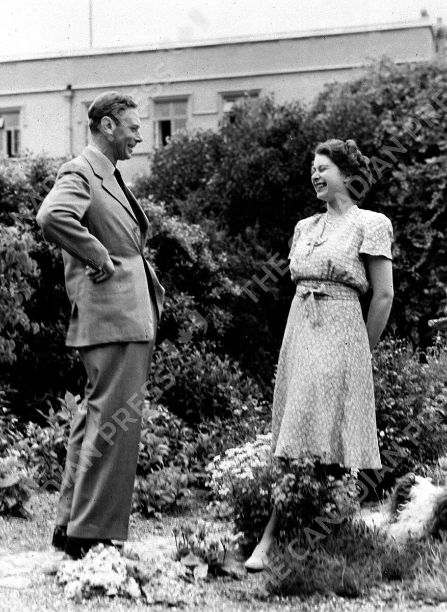 FILE - Britain's Queen Elizabeth II, then Princess Elizabeth, right, reacts with her father King George VI, in the grounds of the Royal Lodge, Windsor, England, Aug. 20, 1946. Queen Elizabeth II will mark 70 years on the throne Sunday, Feb. 6, 2022, an unprecedented reign that has made her a symbol of stability as the United Kingdom navigated an age of uncertainty. (AP Photo, File)