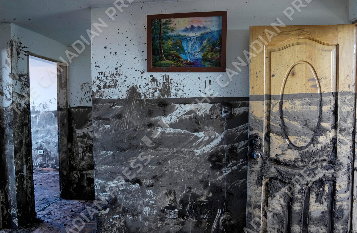 A line on a wall marks the mud level reached inside a home a day after a rain-weakened hillside collapsed and brought waves of mud over homes and a sports field, in the La Gasca neighborhood of Quito, Ecuador, Wednesday, Feb. 2, 2022. (AP Photo/Dolores Ochoa)