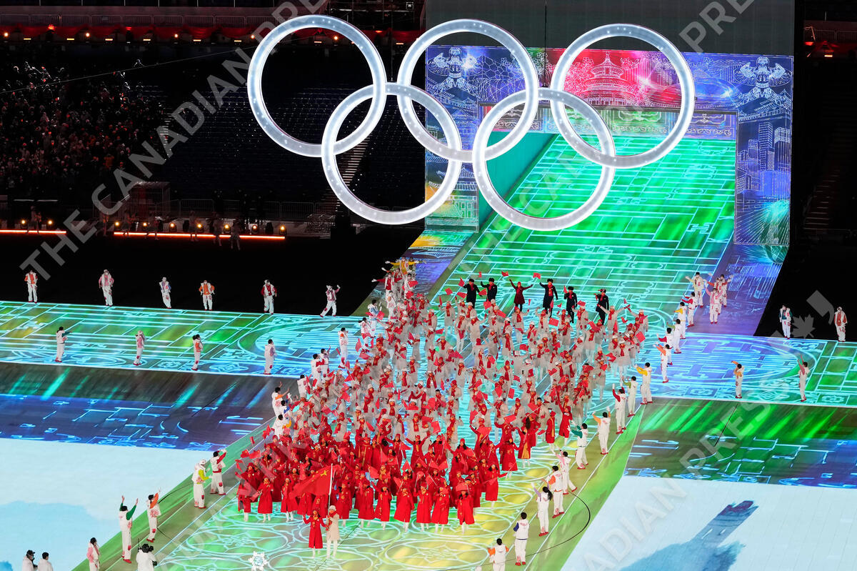 Gao Tingyu and Zhao Dan, of China, carry their national flag into the stadium during the opening ceremony at the 2022 Beijing Winter Olympics in Beijing, China, on Friday, Feb. 4, 2022. THE CANADIAN PRESS/Paul Chiasson