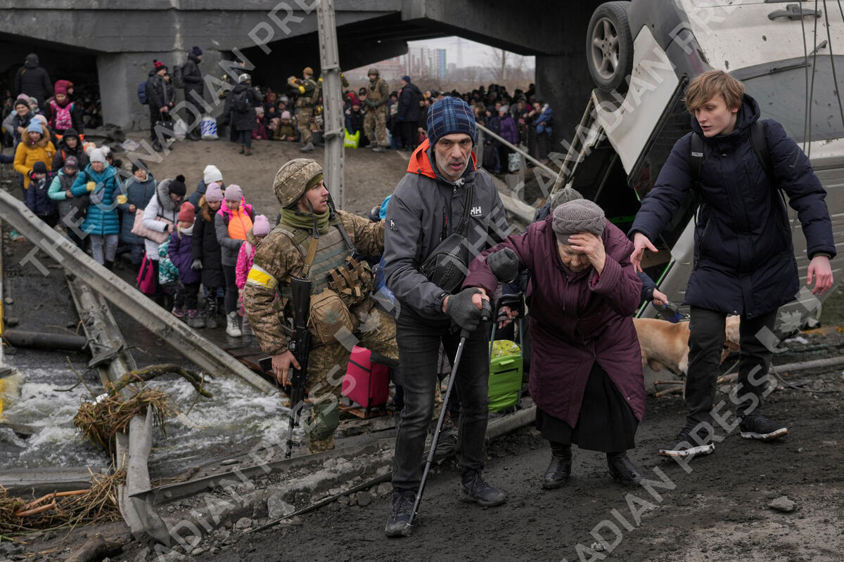 An elderly lady is assisted to cross the Irpin river on an improvised path under a bridge, that was destroyed by Ukrainian troops designed to slow any Russian military advance, while fleeing the town of Irpin, Ukraine, Saturday, March 5, 2022. (AP Photo/Vadim Ghirda)