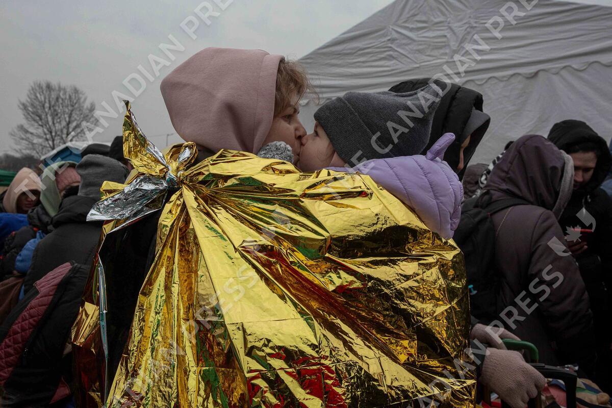 A woman kisses a child after fleeing from the Ukraine and arriving at the border crossing in Medyka, Poland, Monday, March 7, 2022. Russia announced yet another cease-fire and a handful of humanitarian corridors to allow civilians to flee Ukraine. Previous such measures have fallen apart and Moscow's armed forces continued to pummel some Ukrainian cities with rockets Monday. (AP Photo/Visar Kryeziu)