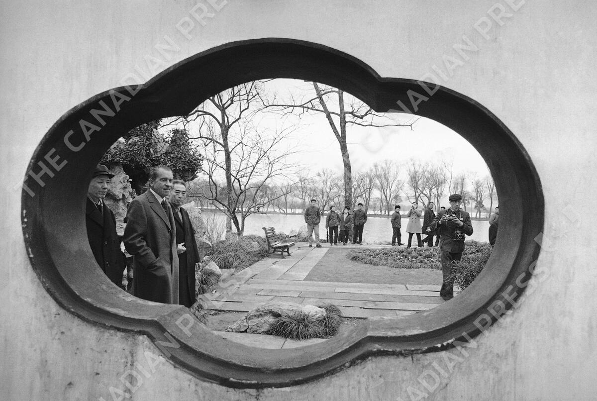 FILE - Framed in the opening of a wall, then U.S. President Richard Nixon and then Chinese Premier Zhou Enlai walks past as they tour Hangzhou in the eastern Chinese province of Zhejiang on Feb. 26, 1972. At the height of the Cold War, U.S. President Richard Nixon flew into communist China's center of power for a visit that over time would transform U.S.-China relations and China's position in the world in ways that were unimaginable at the time. (AP Photo, File)