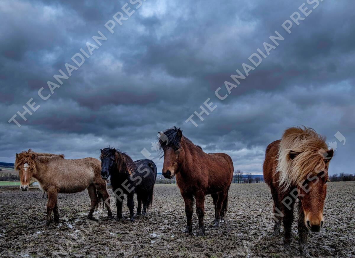 Icelandic horses stand together at a stud farm in Wehrheim near Frankfurt, Germany, Wednesday, Feb. 16, 2022. Parts of Germany expect heavy storms during the next days. (AP Photo/Michael Probst)