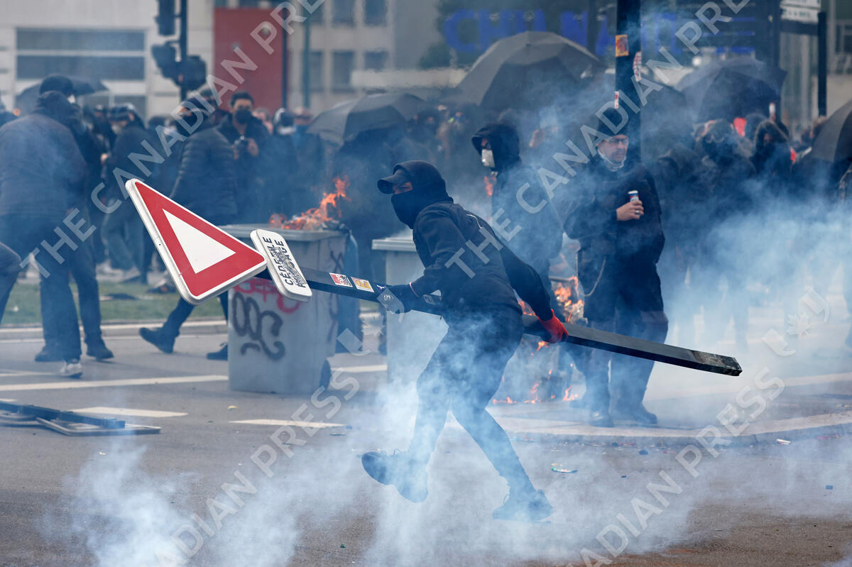 A youth is to throw a street sign during clashes as part of a demonstration Tuesday, March 28, 2023 in Nantes, western France. The fresh wave of strikes and protests is the 10th time since January that unions have called on workers to walk out and for demonstrators to flood the streets against Macron's push to move back France's legal retirement age from 62 to 64. (AP Photo/Jeremias Gonzalez)