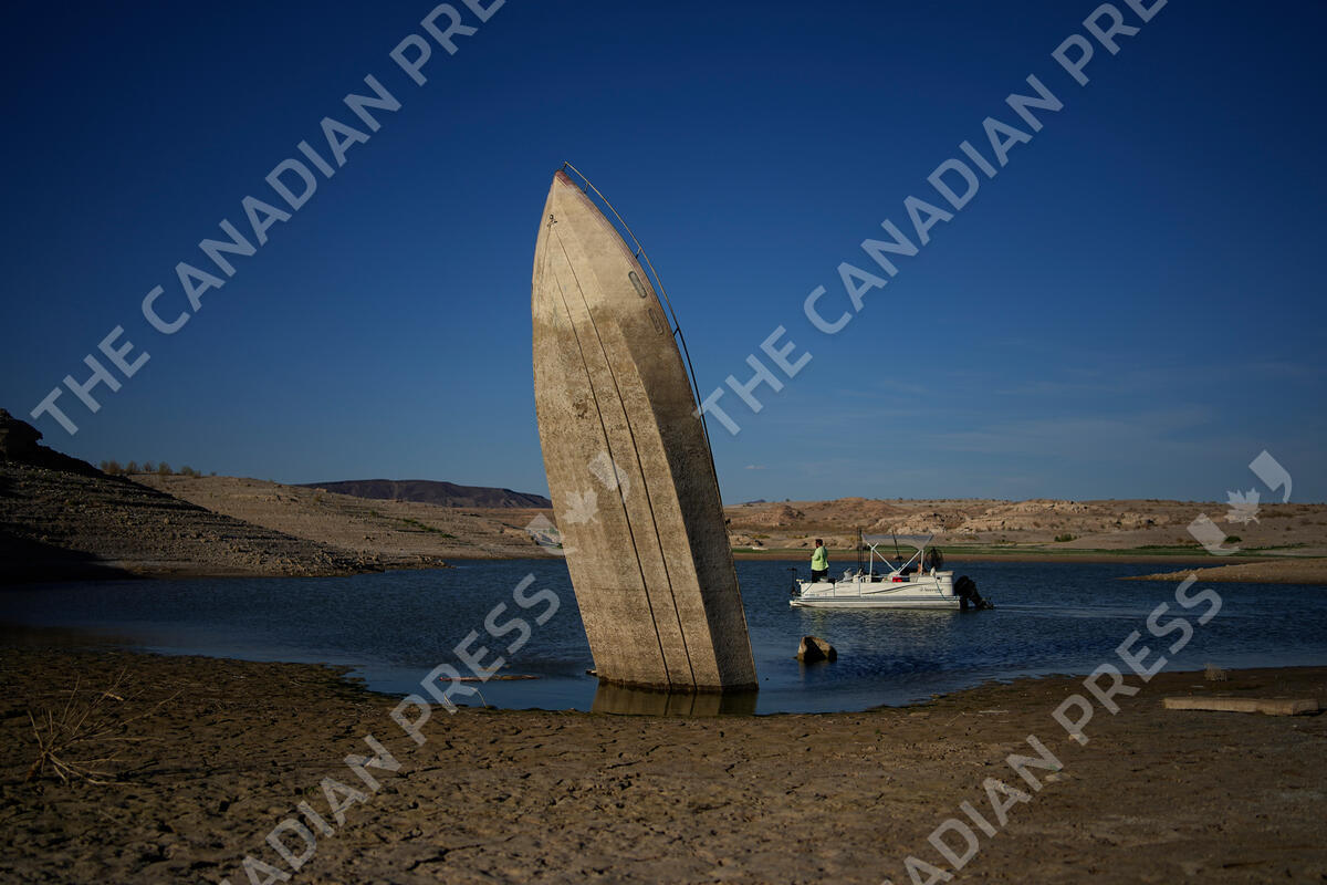 FILE - A formerly sunken boat sits upright into the air with its stern stuck in the mud along the shoreline of Lake Mead at the Lake Mead National Recreation Area, June 10, 2022, near Boulder City, Nev. In November 1922, seven land-owning white men brokered a deal to allocate water from the Colorado River, which winds through the West and ends in Mexico. During the past two decades, pressure has intensified on the river as the driest 22-year stretch in the past 1,200 years has gripped the southwestern U.S. (AP Photo/John Locher, File)
