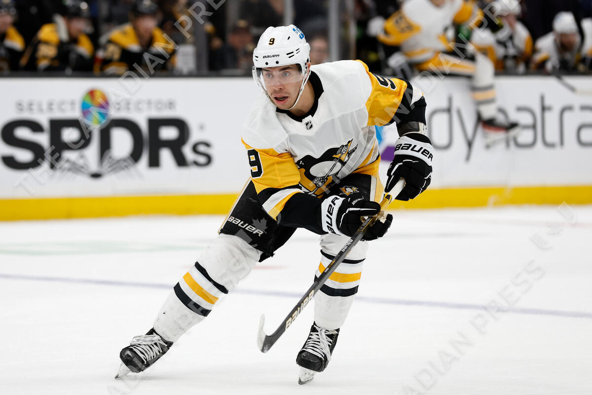 FILE - Pittsburgh Penguins' Evan Rodrigues (9) plays during the first period of an NHL hockey game against the Boston Bruins, Saturday, April 16, 2022, in Boston. The Stanley Cup-champion Colorado Avalanche added more depth at forward by signing Evan Rodrigues to a one-year, $2 million deal on Monday, Sept. 12, 2022. (AP Photo/Winslow Townson, File)