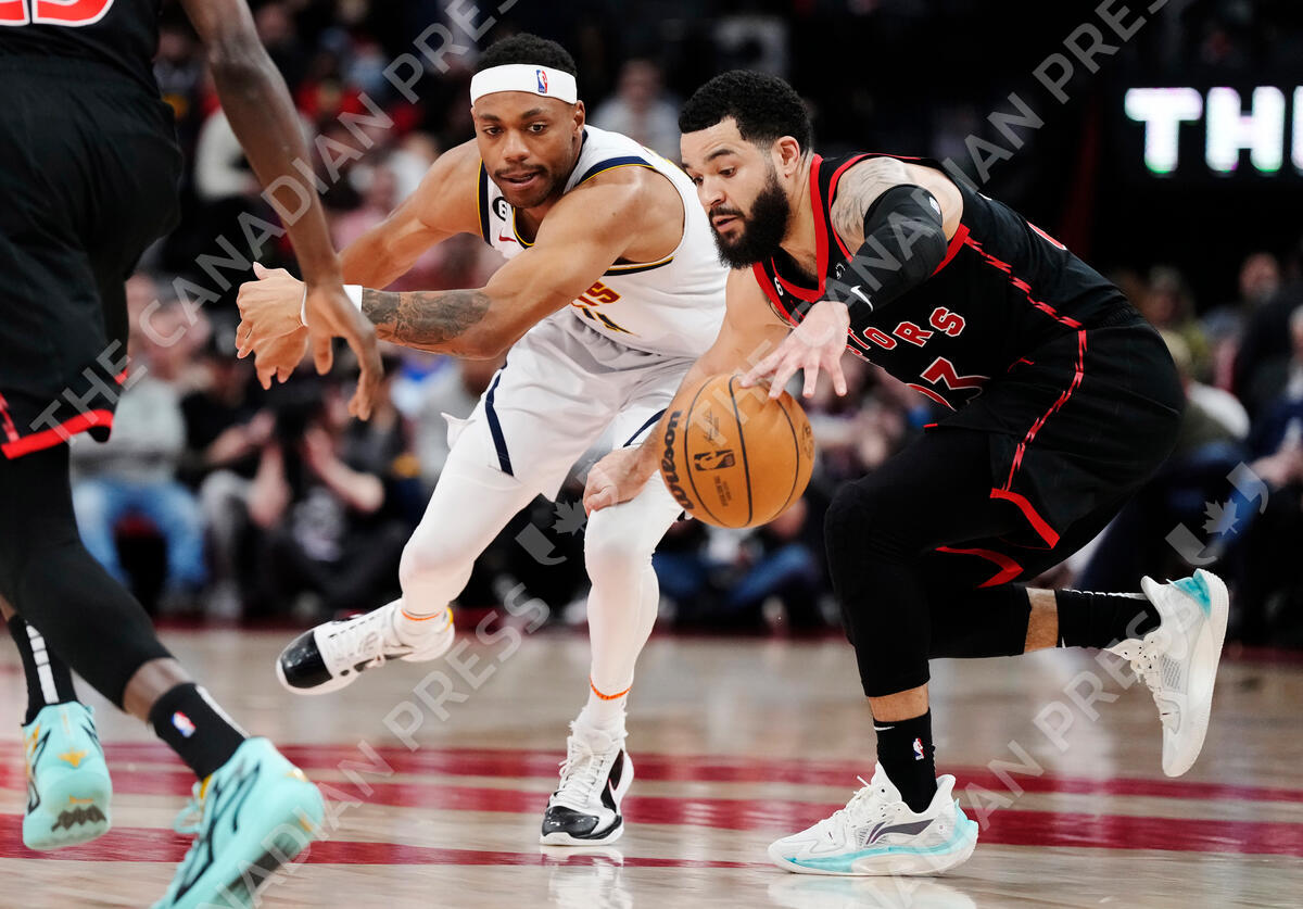 Toronto Raptors guard Fred VanVleet (23) steals the ball from Denver Nuggets forward Bruce Brown (11) during second half NBA basketball action in Toronto on Tuesday, March 14, 2023. THE CANADIAN PRESS/Frank Gunn