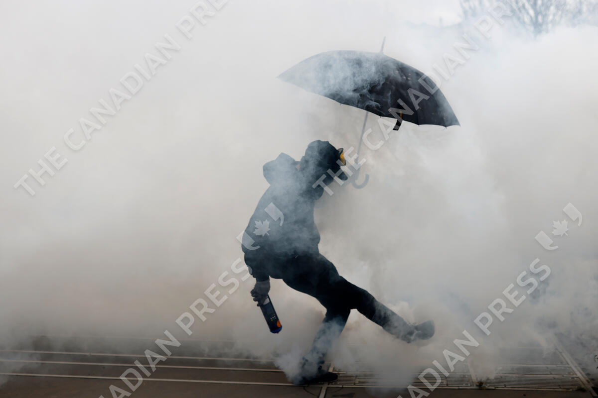 Protesters kicks a teargas canister as he clashes with police during a demonstration in Nantes, western France, Wednesday, March 15, 2023. Opponents of French President Emmanuel Macron's pension plan are staging a new round of strikes and protests as a joint committee of senators and lower-house lawmakers examines the contested bill. (AP Photo/Jeremias Gonzalez)