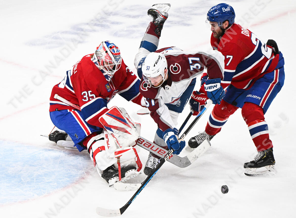 Colorado Avalanche's J.T. Compher (37) collides with Montreal Canadiens goaltender Sam Montembeault and Jonathan Drouin (27) during second period NHL hockey action in Montreal, Monday, March 13, 2023. THE CANADIAN PRESS/Graham Hughes