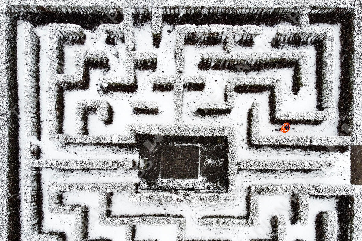 A municipal gardener walks through a snowy maze in a park in Gelsenkirchen, western Germany, on a winter Wednesday, March 8, 2023. (AP Photo/Martin Meissner)