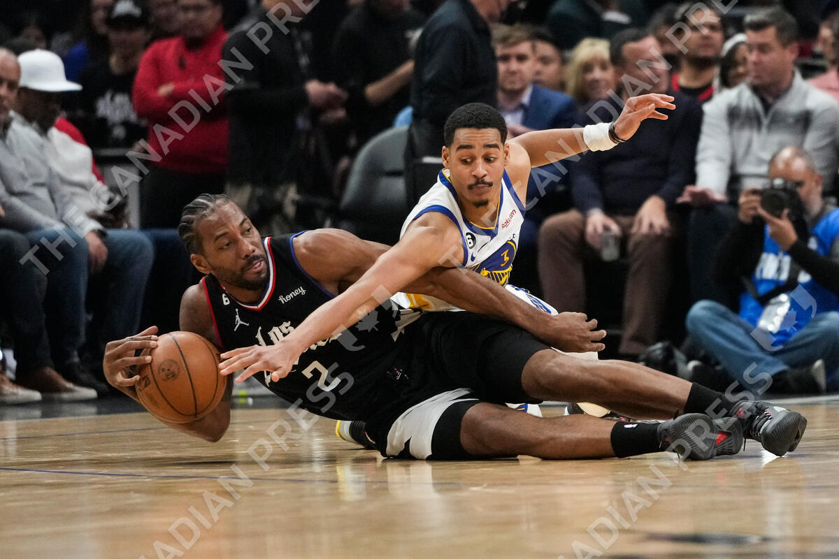 Los Angeles Clippers' Kawhi Leonard (2) and Golden State Warriors' Jordan Poole scramble for the ball during first half of an NBA basketball game Wednesday, March 15, 2023, in Los Angeles. (AP Photo/Jae C. Hong)