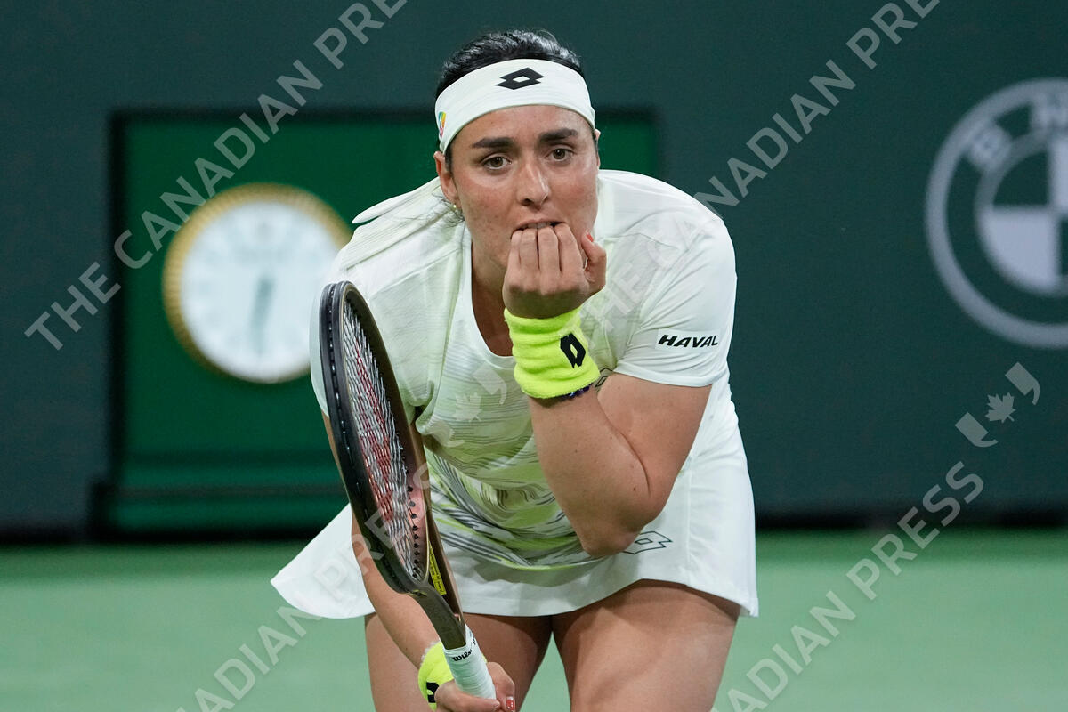 Ons Jabeur, of Tunisia, reacts to a point lost to Magdalena Frech, of Poland, at the BNP Paribas Open tennis tournament Saturday, March 11, 2023, in Indian Wells, Calif. (AP Photo/Mark J. Terrill)