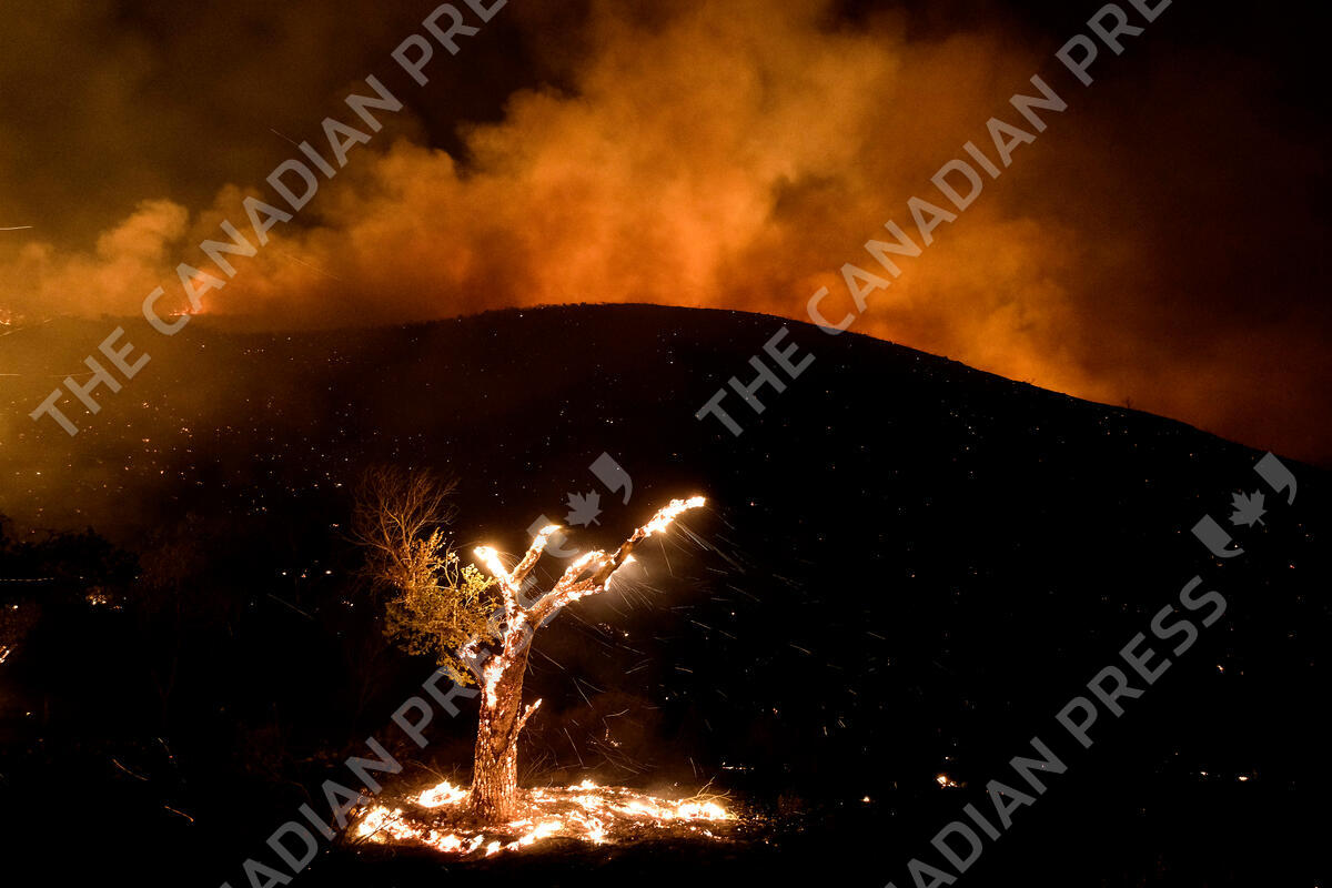 Wind whips embers from a burning tree during a wildfire Tuesday, Sept. 6, 2022, near Hemet, Calif. (AP Photo/Ringo H.W. Chiu)