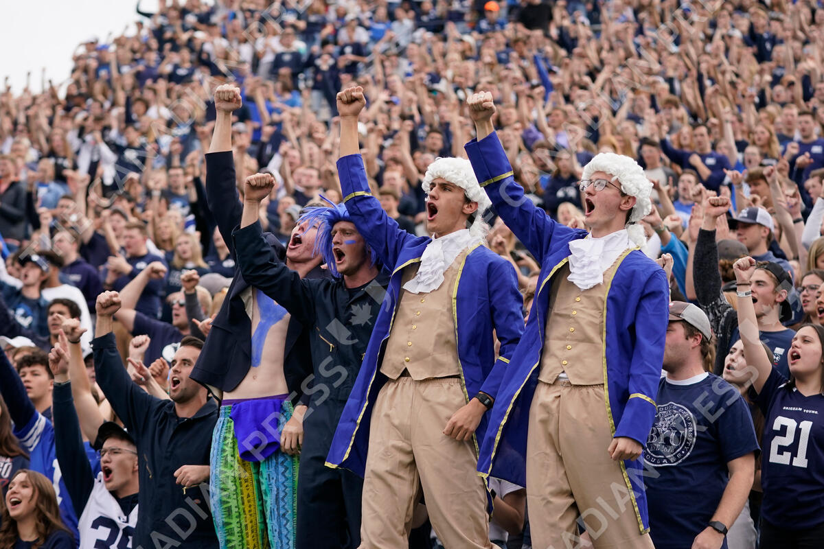 FILE - BYU fans celebrates after their team scores against Idaho State in the first half during an NCAA college football game Saturday, Nov. 6, 2021, in Provo, Utah. To prepare for No. 21 BYU on Saturday night, Sept. 10, 2022, and the thunderous noise inside LaVell Edwards Stadium, the Bears have been piping in sound at practice. (AP Photo/Rick Bowmer, File)