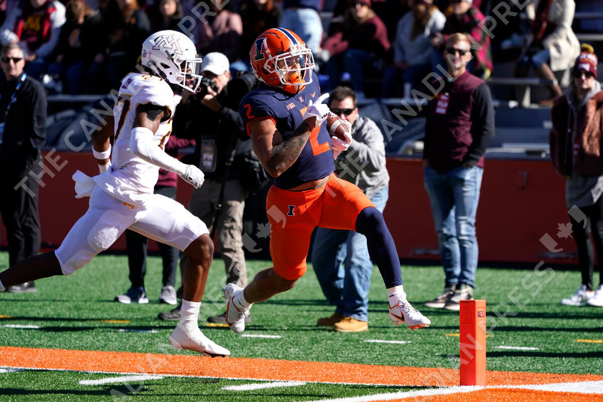 Illinois running back Chase Brown scores off a pass from quarterback Tommy DeVito as Minnesota 's Tyler Nubin defends during the first half of an NCAA college football game Saturday, Oct. 15, 2022, in Champaign, Ill. (AP Photo/Charles Rex Arbogast)