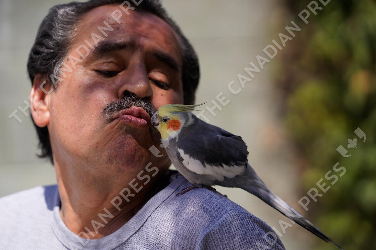 Painter Valentin Acosta kisses his pet bird, Rulo, in South Los Angeles, Saturday, June 17, 2023. (AP Photo/Damian Dovarganes)