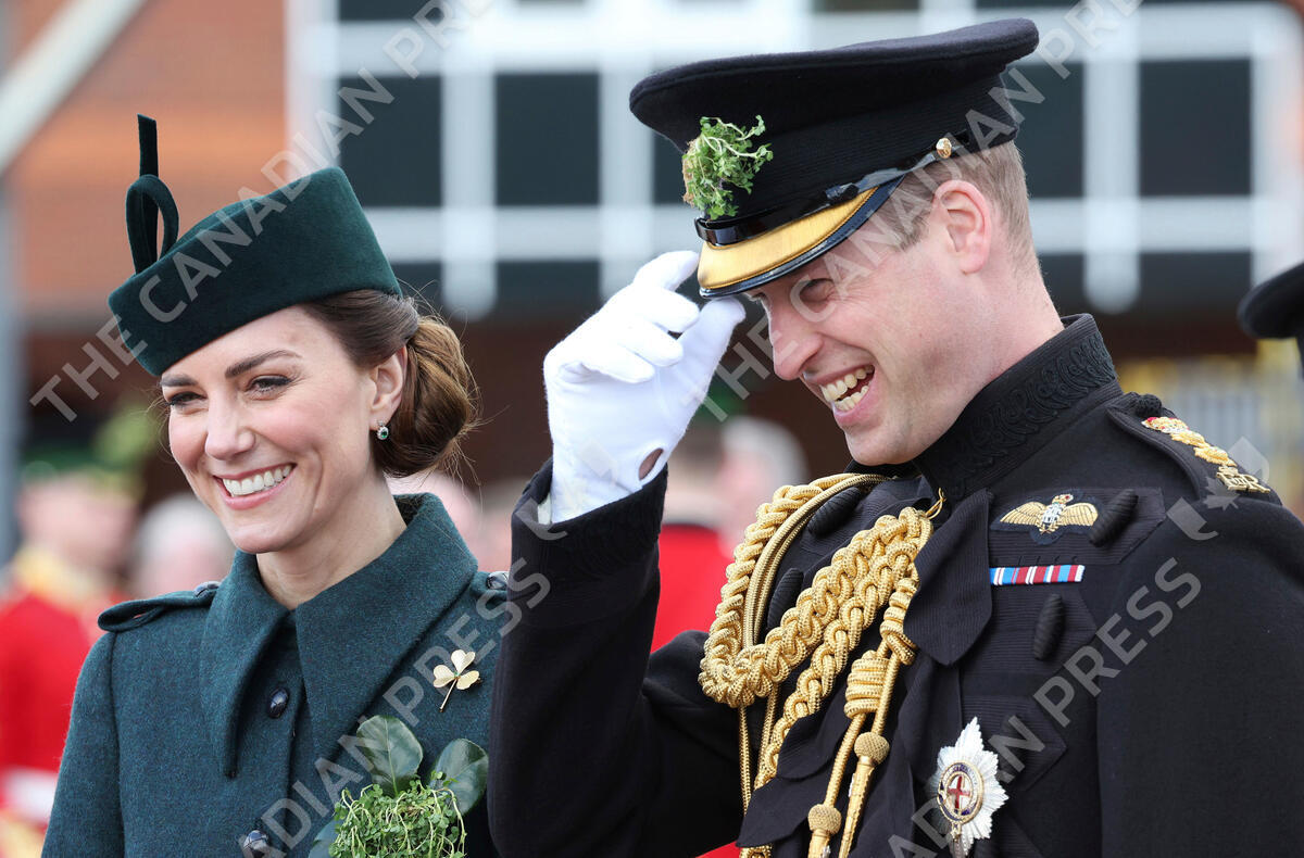 FILE - Britain's Prince William and Kate, Duchess of Cambridge attend the 1st Battalion Irish Guards' St. Patrick's Day Parade at Mons Barracks, Thursday March 17, 2022 in Aldershot, England. Long before he became King Charles III, Britain’s new monarch had indicated that he wants a “slimmed down†monarchy with a tighter core group of full-time working royals and lower expenses. (Chris Jackson/Pool via AP, File)