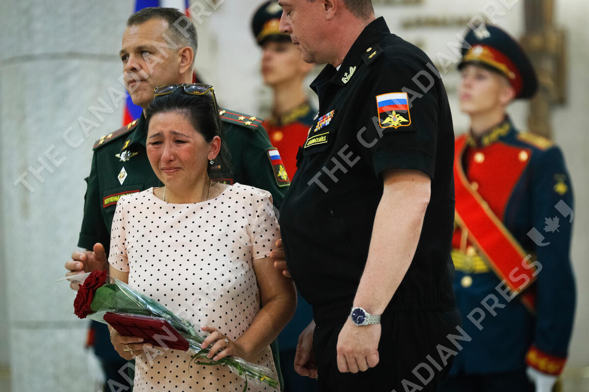 FILE - Alima Tatiyeva, widow of Nurlan Tatiyev, Russian soldier who was killed in battles in Ukraine cries during a ceremony of handing over the Orders of Courage to families of killed soldiers in Volgograd, Russia, Thursday, June 30, 2022. (AP Photo, File)