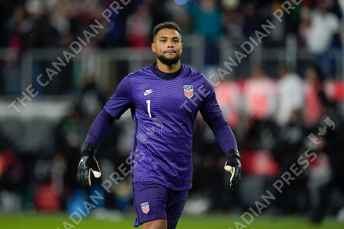 FILE - United States' Zack Steffen reacts at the end of a FIFA World Cup qualifying soccer match between Mexico and the United States, Friday, Nov. 12, 2021, in Cincinnati. Steffen missed his fourth straight game for Middlesbrough, raising doubt whether he will be available for the United States' last two warmup matches ahead of the World Cup. (AP Photo/Julio Cortez, File)