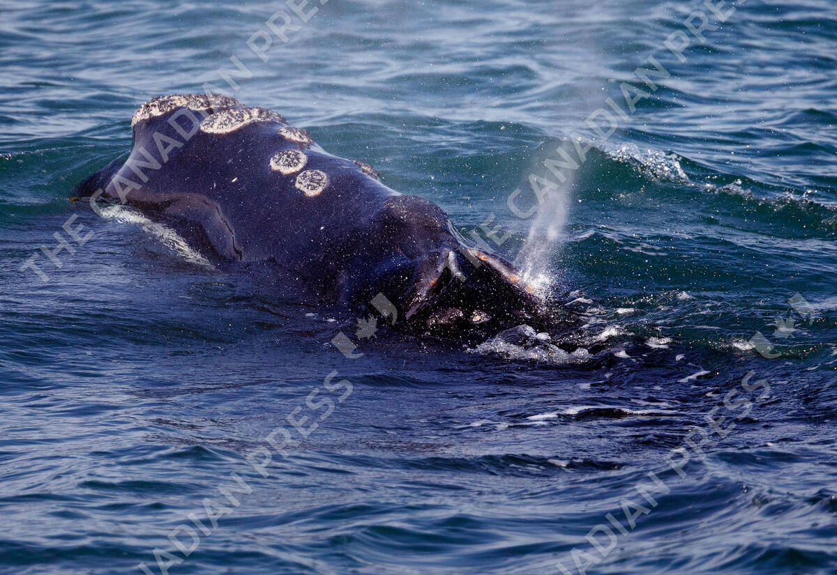 FILE - A North Atlantic right whale feeds on the surface of Cape Cod Bay off the coast of Plymouth, Mass., on March 28, 2018. Maine Gov. Janet Mills said Tuesday, Sept. 13, 2022, the federal government is moving ahead too quickly with potential new restrictions on the lobster fishing industry. The National Oceanic and Atmospheric Administration recently announced it was seeking input on new rules to reduce risk to rare whales. (AP Photo/Michael Dwyer, File)