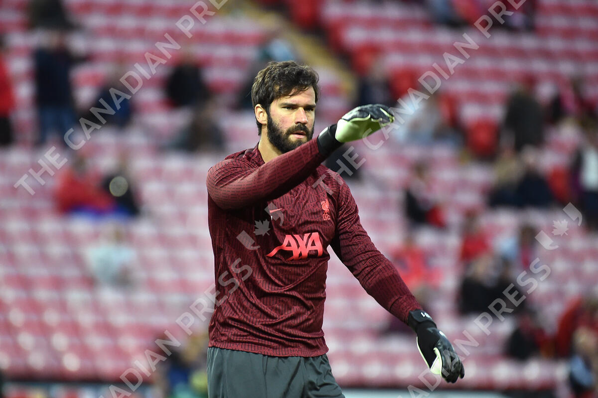 Liverpool's goalkeeper Alisson warms up prior to the start of the Champions League group A soccer match between Liverpool and Ajax at Anfield stadium in Liverpool, England, Tuesday, Sept. 13, 2022. (AP Photo/Rui Vieira)