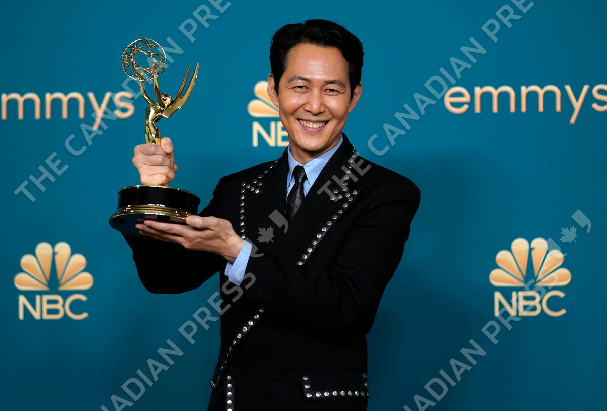 Lee Jung-jae, winner of the Emmy for outstanding lead actor in a drama series for "Squid Game", poses in the press room at the 74th Primetime Emmy Awards on Monday, Sept. 12, 2022, at the Microsoft Theater in Los Angeles. (AP Photo/Jae C. Hong)