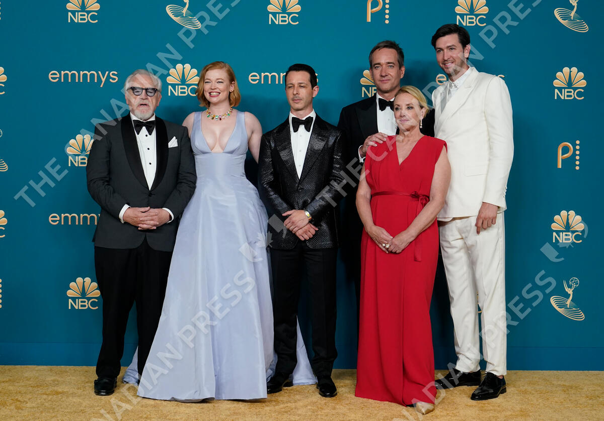 Brian Cox, from left, Sarah Snook, Jeremy Strong, Matthew Macfadyen, J. Smith-Cameron, and Nicholas Braun, winners of the Emmy for outstanding drama series for "Succession", pose in the press room at the 74th Primetime Emmy Awards on Monday, Sept. 12, 2022, at the Microsoft Theater in Los Angeles. (AP Photo/Jae C. Hong)