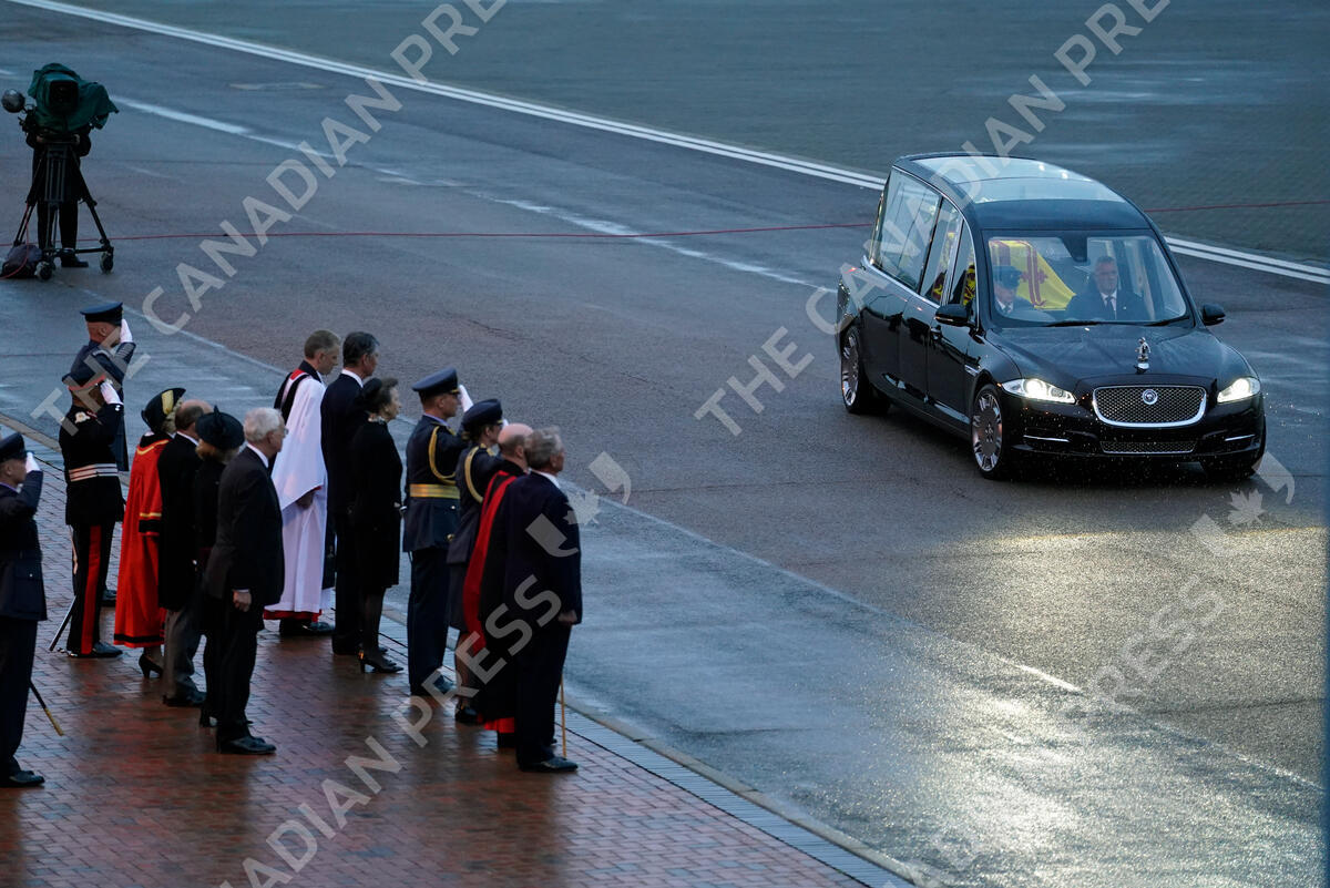 The coffin of Queen Elizabeth II is carried to the waiting hearse at RAF Northolt, London, Tuesday Sept. 13, 2022, from where it will be taken to Buckingham Palace. (Andrew Matthews/Pool via AP)