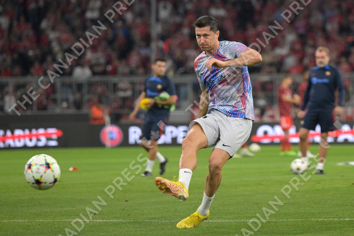 Barcelona's Robert Lewandowski warms up prior to the Champions League, group C soccer match between Bayern Munich and Barcelona at the Allianz Arena in Munich, Germany, Tuesday, Sept. 13, 2022. (AP Photo/Andreas Schaad)