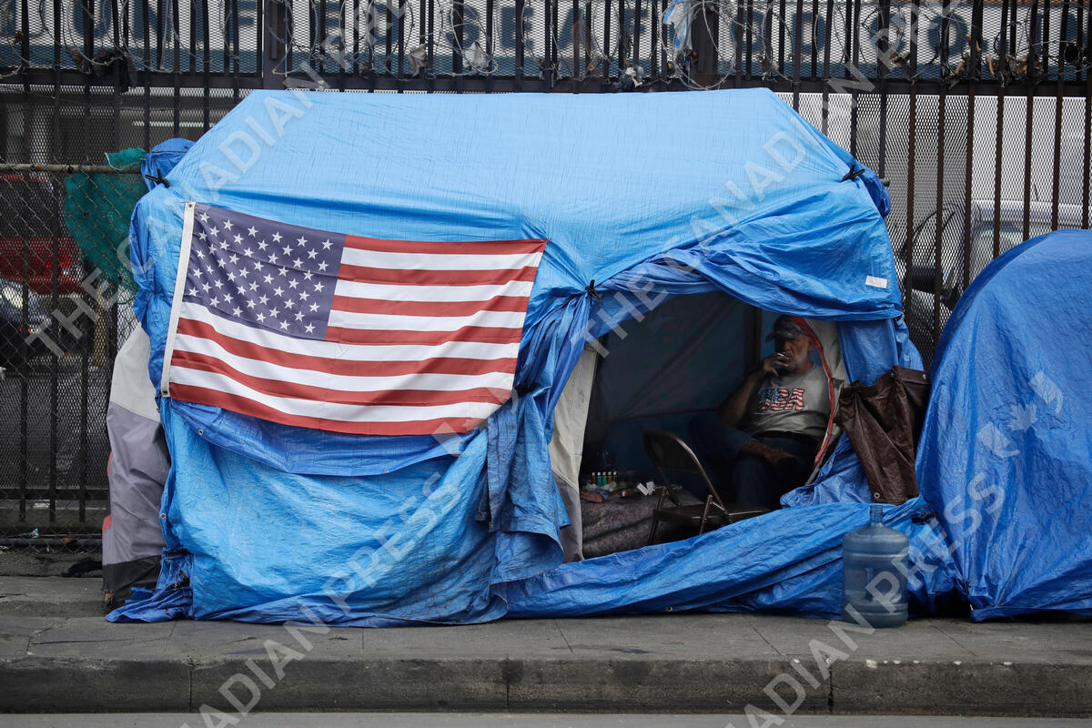 FILE - A man smokes inside a tent on skid row on March 20, 2020, in Los Angeles. Los Angeles County leaders announced Monday, Sept. 12, 2022, a lawsuit settlement agreement that commits hundreds of millions of dollars to expand outreach and supportive services for homeless residents, marking the potential end of two years of litigation over the crisis of people living on the streets. (AP Photo/Marcio Jose Sanchez, File)
