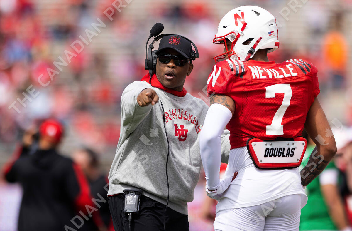 FILE - Then-Nebraska associate head coach and wide receivers/passing game coordinator Mickey Joseph chats with red team wide receiver Latrell Neville (7) during the second half of Nebraska's NCAA college football annual red-white spring game at Memorial Stadium in Lincoln, Neb., Saturday, April 9, 2022. Mickey Joseph begins his run as Nebraska's interim head coach following Scott Frost's firing. (AP Photo/Rebecca S. Gratz, File)
