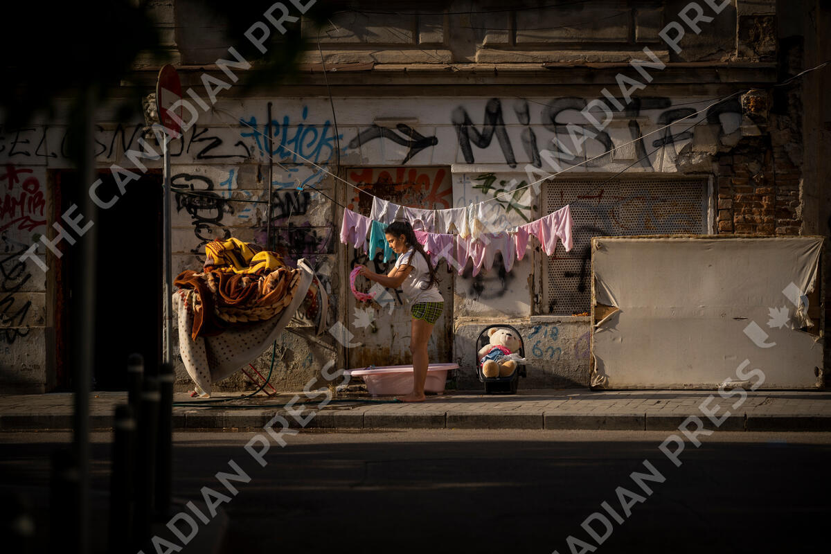 A child hangs baby clothing for drying, outside an old building in downtown Bucharest, Romania, Saturday, June 3, 2023. (AP Photo/Vadim Ghirda)