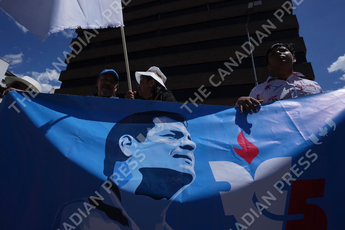 Supporters of the Citizen Revolution Movement party hold a banner with an image of former President Rafael Correa, also the party leader, as they cheer on their presidential candidate for the upcoming early elections, in Quito, Ecuador, Tuesday, June 13, 2023. Early elections, scheduled for August, were prompted by Ecuadorian President Guillermo Lasso's decision to dissolve the National Assembly, when it appeared on the verge of ousting him in impeachment proceedings. (AP Photo/Dolores Ochoa)