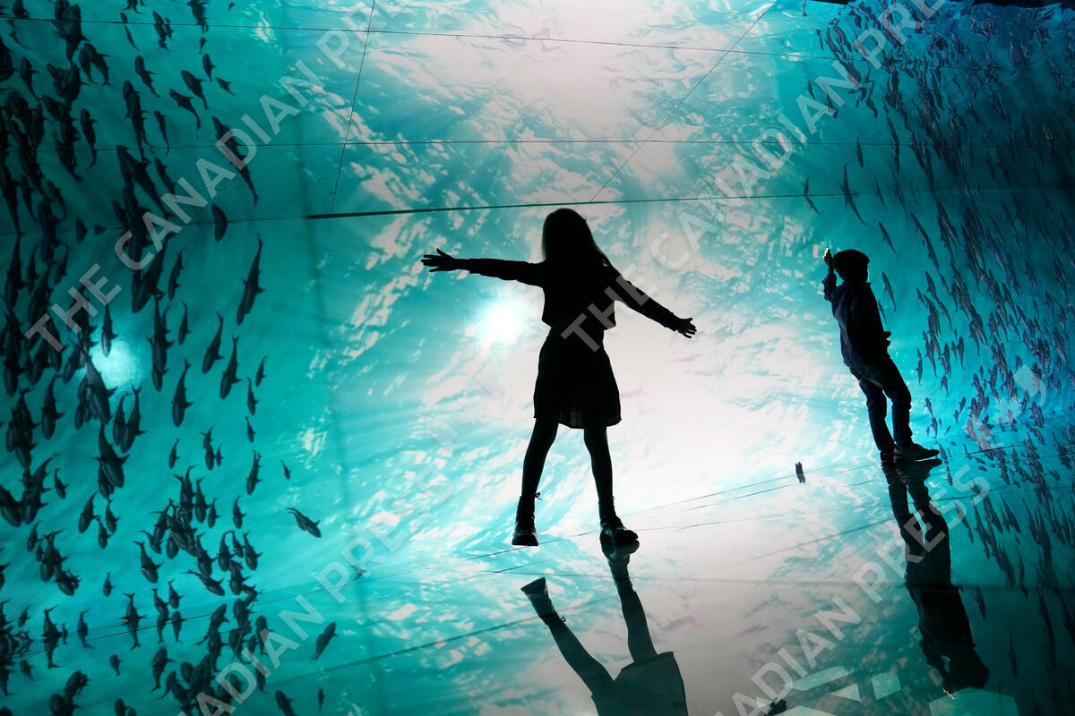 Children walk amid a mirror installation titled "Sea of Mirrors," featuring digital images of fish in the ocean during a preview tour the day before the show's public opening at the AquaRio aquarium in Rio de Janeiro, Brazil, Wednesday, June 14, 2023. (AP Photo/Silvia Izquierdo)
