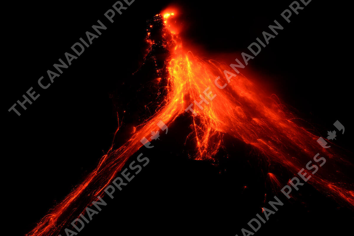 Lava flows down the slopes of Mayon volcano as seen from Daraga town, Albay province, northeastern Philippines, Tuesday, June 13, 2023. Truckloads of villagers on Tuesday fled from Philippine communities close to gently erupting Mayon volcano, traumatized by the sight of red-hot lava flowing down its crater and sporadic blasts of ash. (AP Photo/Aaron Favila)