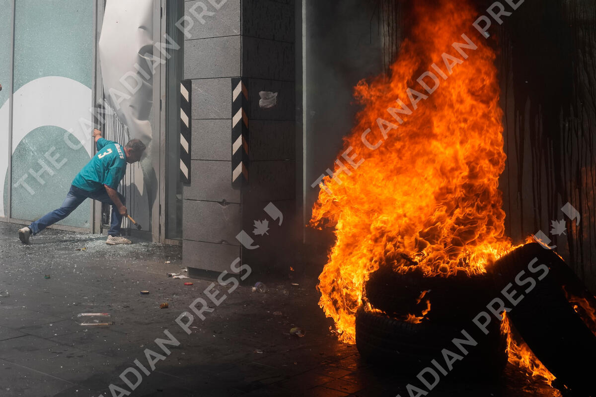 A protester smashes windows at Bank Audi during a protest demanding the release of depositors' trapped savings, in Beirut, Lebanon, Thursday, June 15, 2023. Since Lebanon fell into a financial crisis in 2019, the banks have imposed informal capital controls, restricting depositors from accessing their funds, while the country's currency has collapsed and inflation has spiraled. (AP Photo/Hussein Malla)