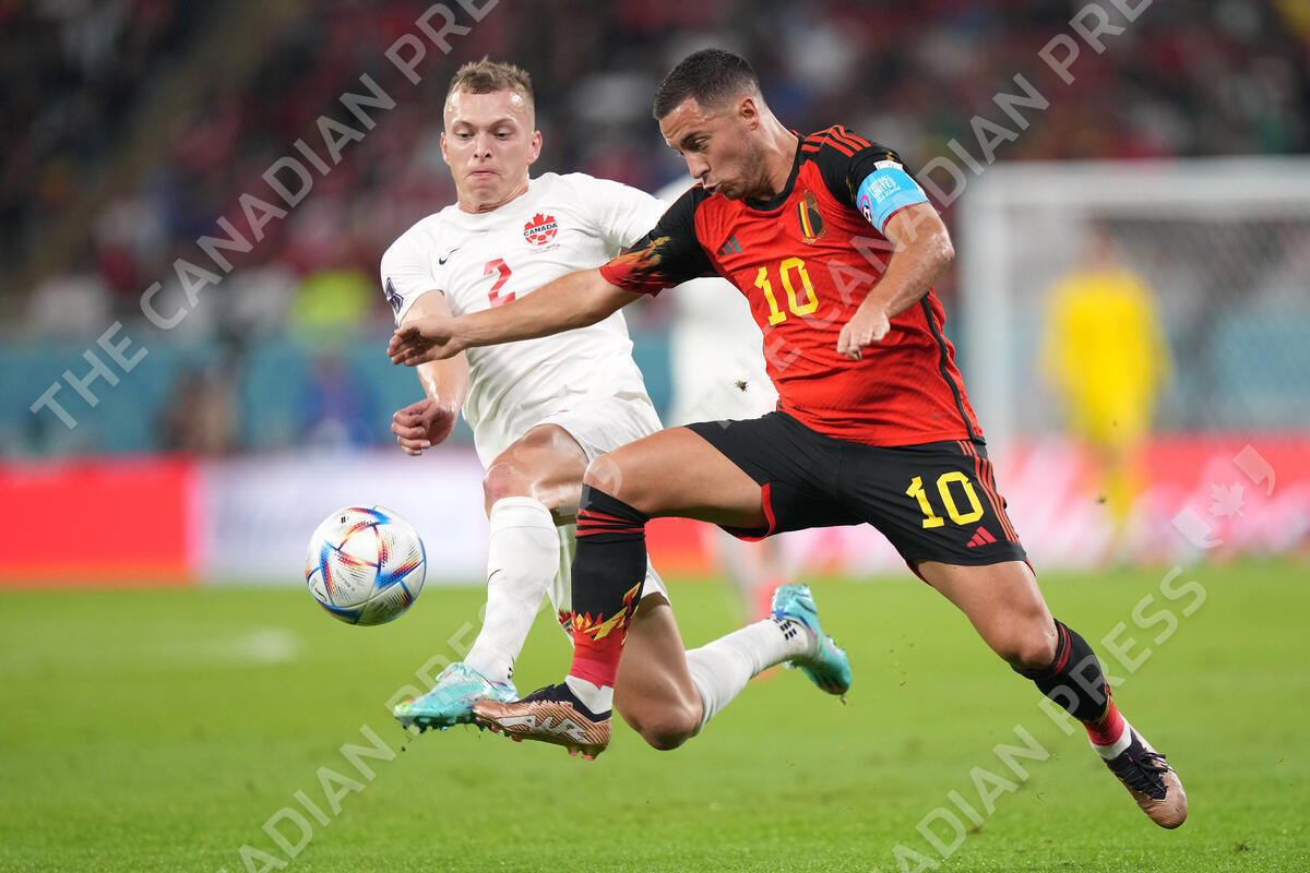 Belgium forward Eden Hazard (10) plays the ball as Canada defender Alistair Johnston (2) defends during first half Group F World Cup soccer action at Ahmad bin Ali Stadium in Al Rayyan, Qatar, on Wednesday, Nov. 23, 2022. THE CANADIAN PRESS/Nathan Denette