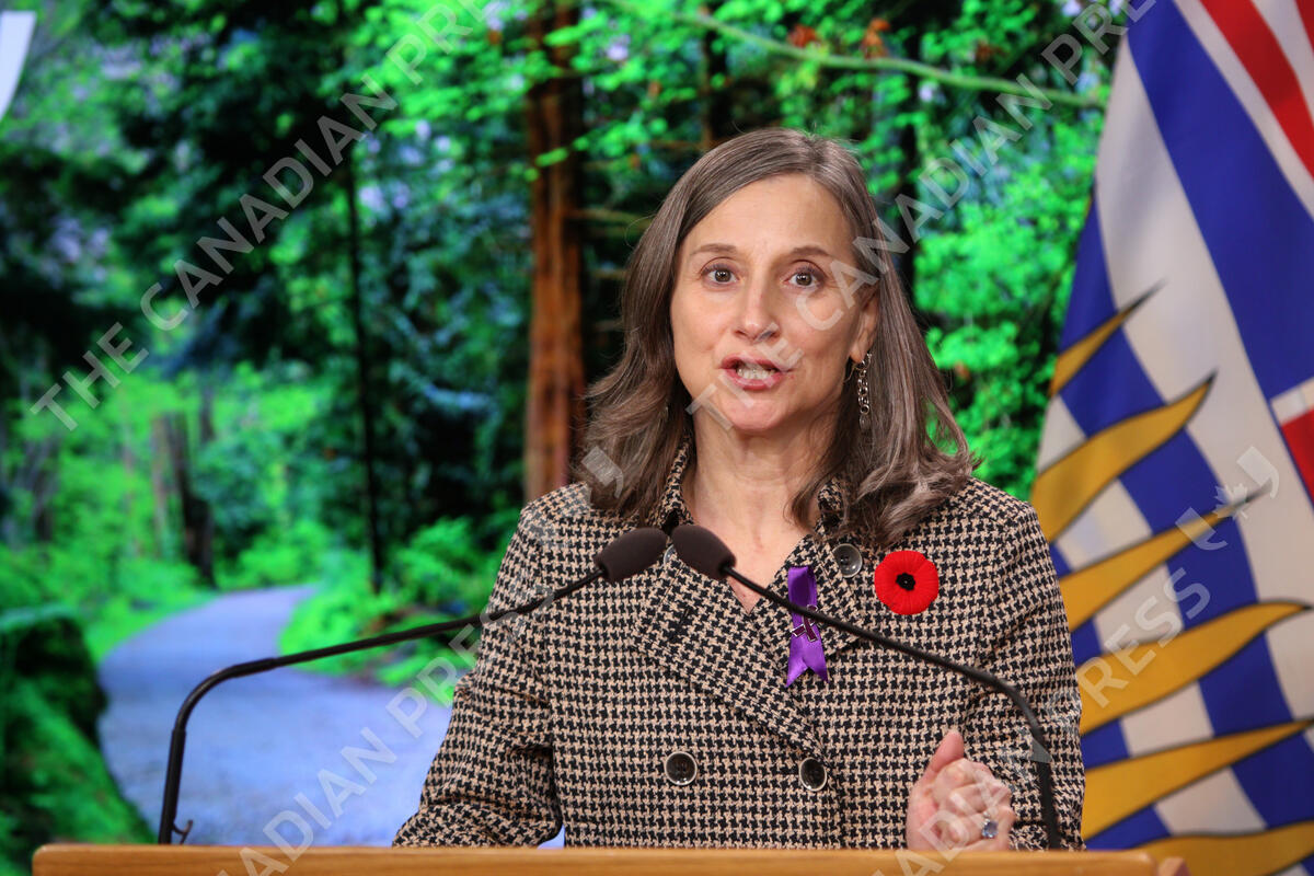 B.C. chief coroner Lisa Lapointe speaks during a press conference in the press gallery at the Legislature in Victoria, Monday, Nov. 1, 2021. Lapointe says the increased toxicity and variability of street drugs has created an environment where everyone who uses substances is at risk.THE CANADIAN PRESS/Chad Hipolito