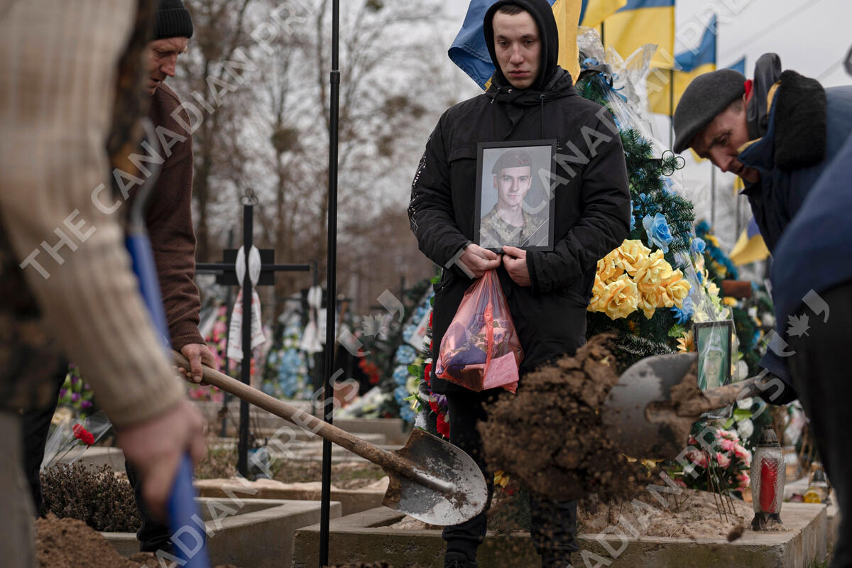 Cemetery workers bury the coffin of Ukrainian soldier Danylo Lysenko, 22, during his funeral in Boyarka, near Kyiv, Ukraine, Saturday, March 18, 2023. (AP Photo /Andrew Kravchenko)