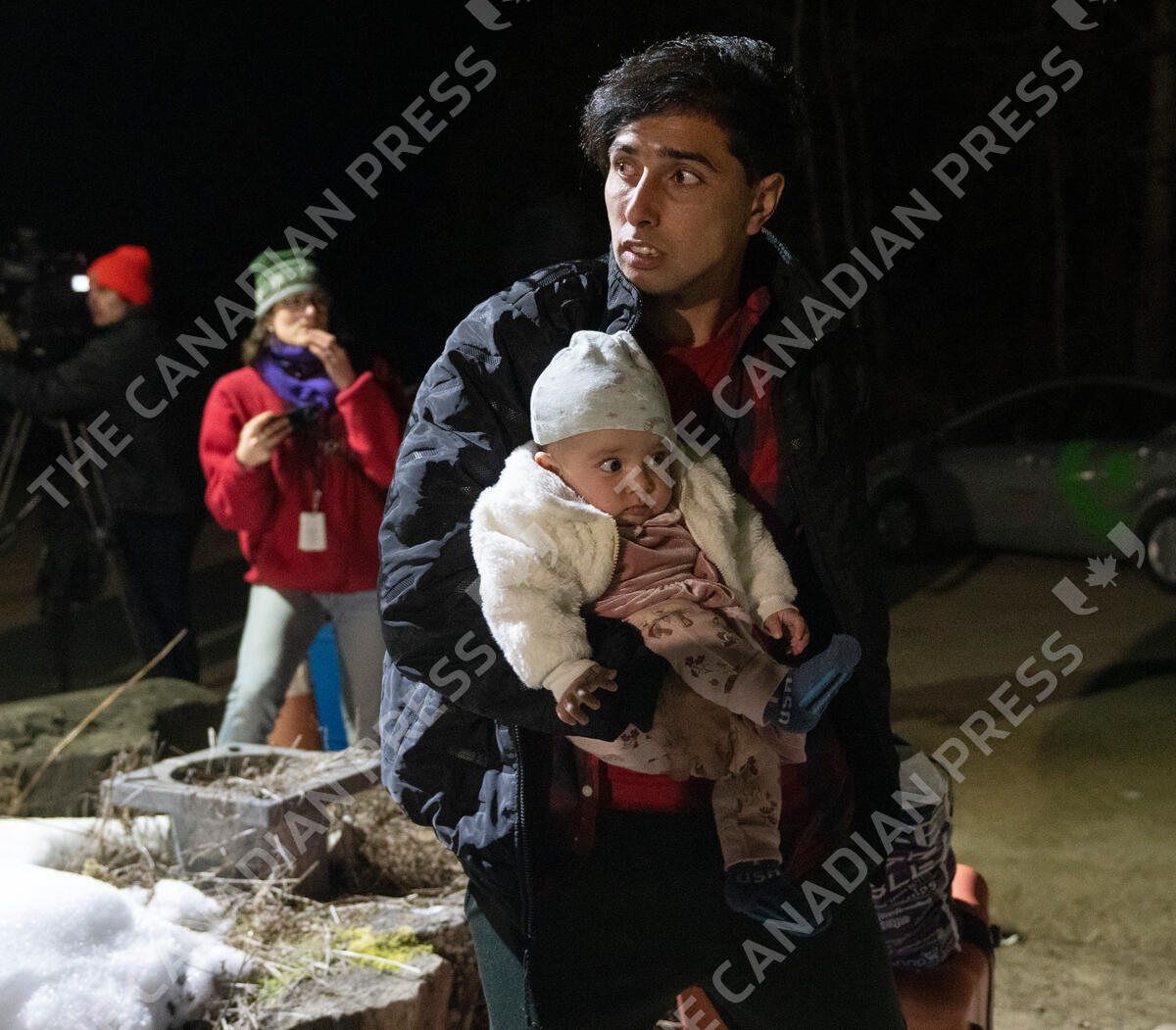 Asylum seeker Mahamed Yusef Niazi, from Afghanistan, carries his seven-month-old daughter Sahaba, across the border at Roxham Road from New York into Canada Friday March 24, 2023 in Champlain, NY.. The irregular border crossing will be closed permanently tonight at midnight. THE CANADIAN PRESS/Ryan Remiorz
