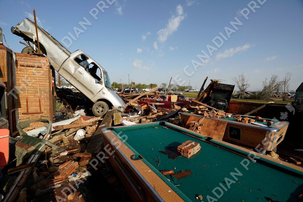 A pickup truck rests on top of a restaurant cooler at Chuck's Dairy Cafe in Rolling Fork, Miss., Saturday, March 25, 2023.