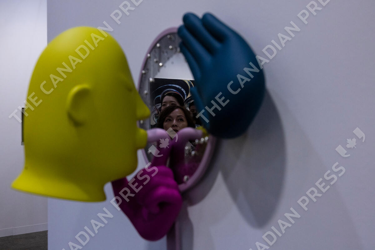 A visitor's reflection is seen through an artwork titled "Reflections" created by Australian artist Mark Whalen at the Art Basel during a preview in Hong Kong, Tuesday, March 21, 2023. (AP Photo/Louise Delmotte)