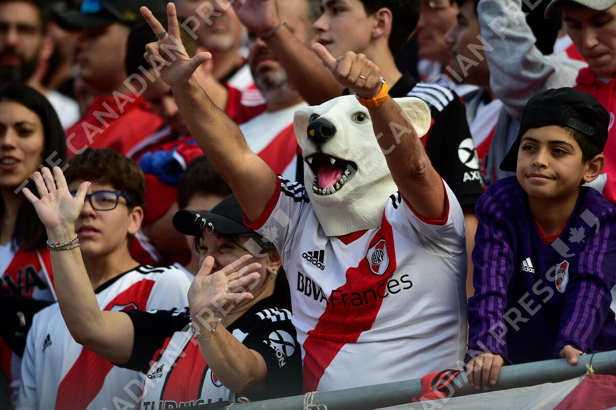 Fans of River Plate cheer before the start a local tournament soccer match against Boca Juniors at Monumental stadium in Buenos Aires, Argentina, Sunday, May 7, 2023.(AP Photo/Gustavo Garello)