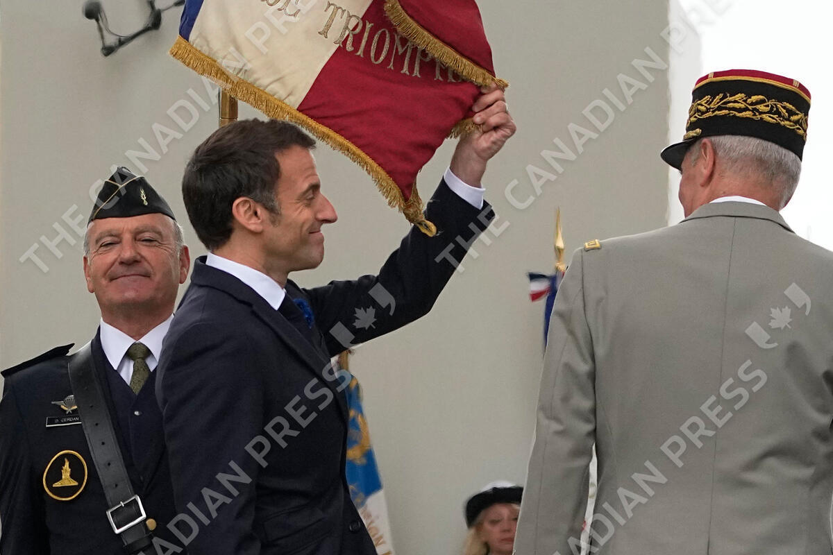 French President Emmanuel Macron touches the national flag at the tomb of the Unknown Soldier, under the Arc de Triomphe, during ceremonies marking Victory Day, Monday, May 8, 2023 in Paris. (AP Photo/Michel Euler, Pool)