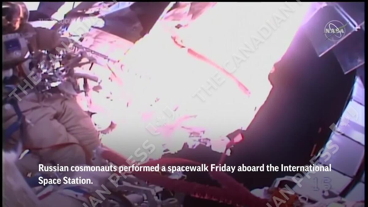 Russian cosmonauts perform a spacewalk aboard the International Space Station to deploy a radiator and other equipment.