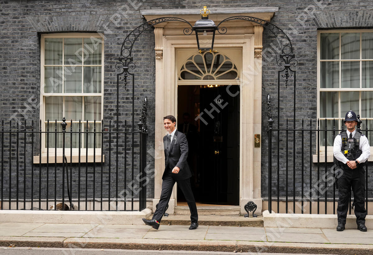 Canadian Prime Minister Justin Trudeau leaves after visiting 10 Downing Street to meet with British Prime Minister Liz Truss in London on Sunday, September 18, 2022, ahead of the funeral service for the late Queen Elizabeth II. THE CANADIAN PRESS/Nathan Denette